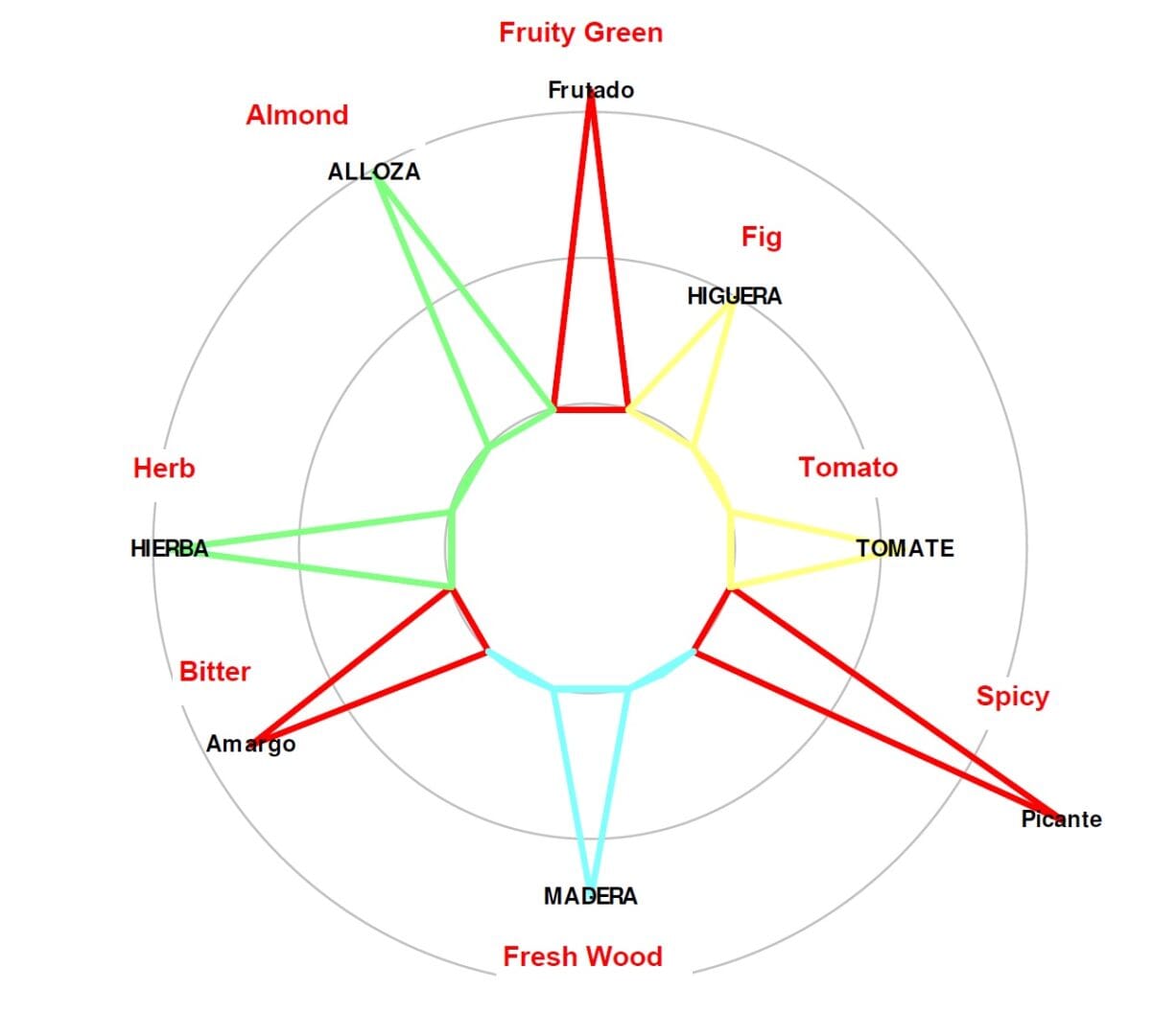 - Dieses Olivenöl zeichnet sich durch seine Frische mit Noten von grünen Mandeln und frisch geschnittenem Gras aus und hat die charakteristische Note der Sorte Arbequina.