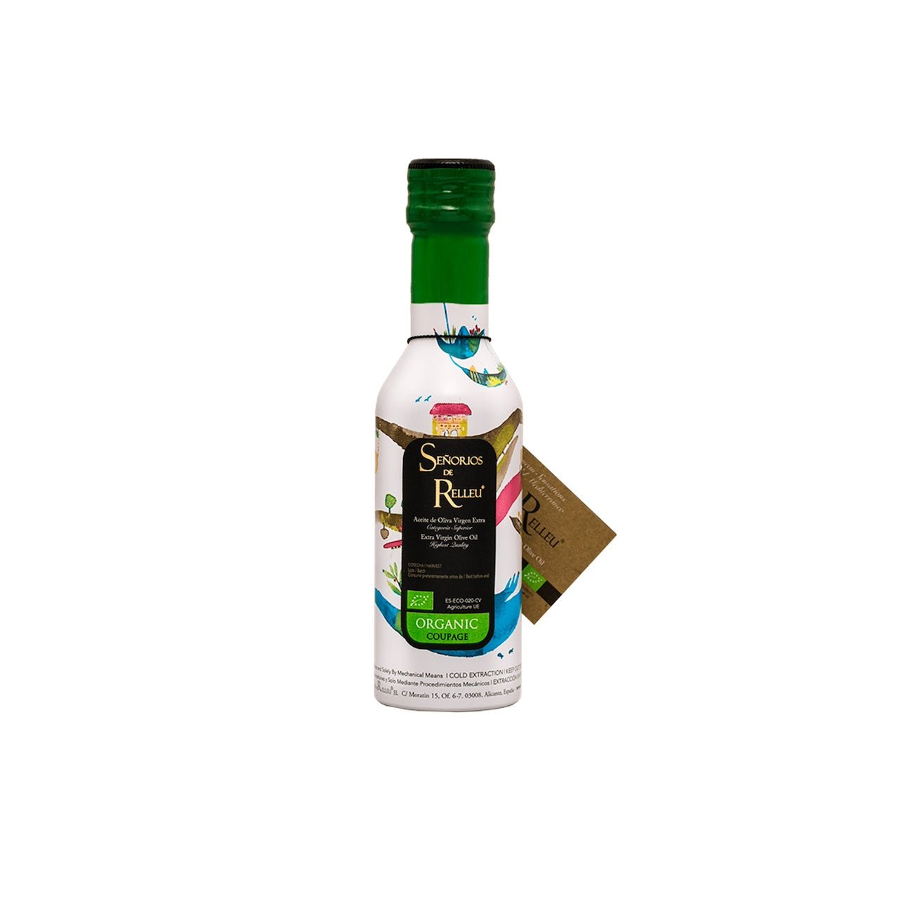 Señorios de Relleu has produced this extra virgin olive oil in a completely ecological and sustainable way in honor of their 100th anniversary of their headquarters in Relleu. This bottle, with a watercolor illusion that tells the story of Señorios de Relleu, is an ode to their environment and the preservation of the territory. Made with passion for family and produced on Arab terraces in mountainous areas with regional varieties such as Manzanilla Villalonga, Blanqueta, Changlot Real, Alfafara, Genovesa and Arbequina.